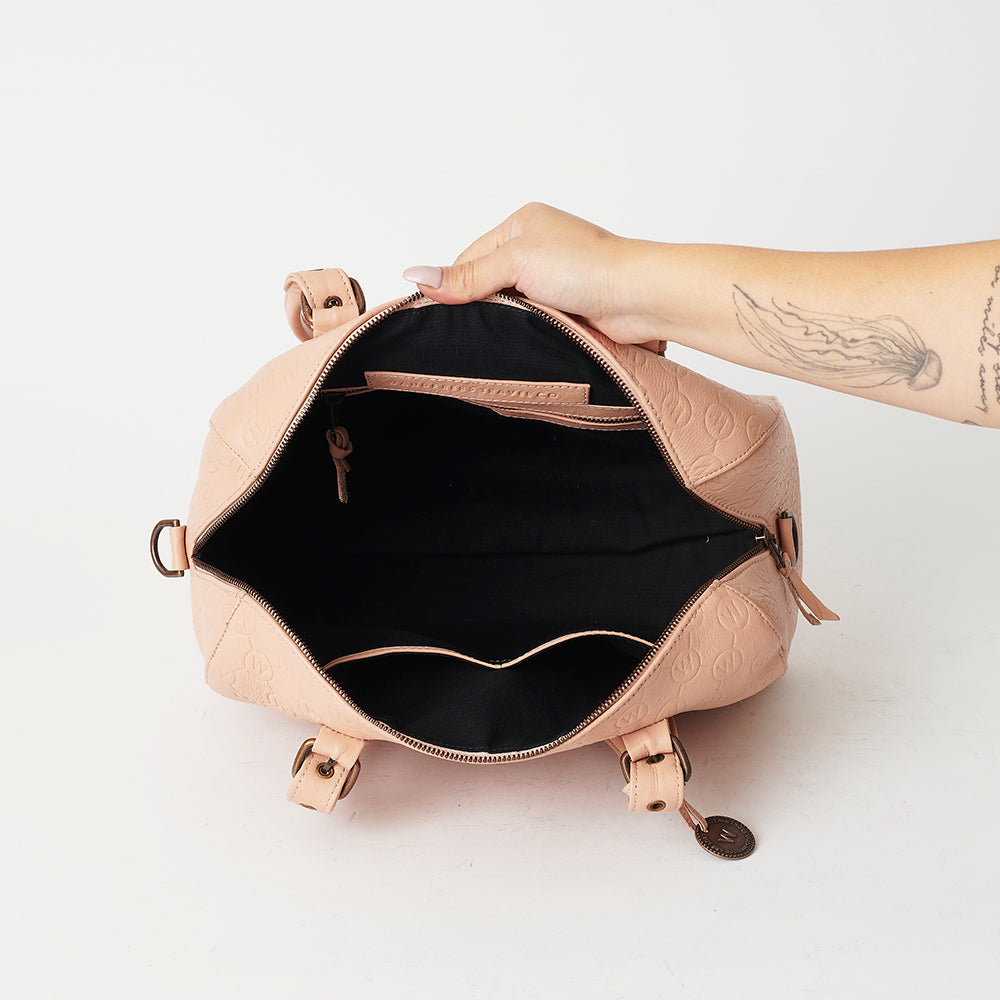 Our Francesca Grande handbag resembles that of the many Italian designer bags that grace the arms of successful businesswomen the world over. Embossed with the Wanderers signature monogram, this divine design shouts luxury, with adjustable grommet leather handles, ample storage, internal pockets and a removable crossbody strap. Beauty and strength combine in one of our most luxurious and personal items yet for the Wanderers La Donna collection.