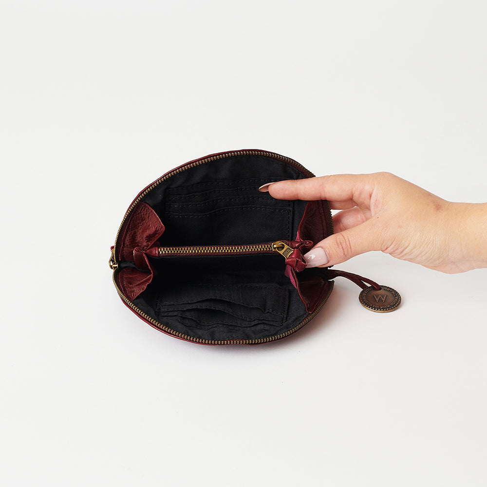 Our Liliana wallet is a simple and beautifully curved leather piece that would accompany any of our leather bags. Its internal zipper and multiple card holders make it as practical as it is pretty.