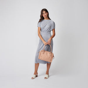 The only way to access this well-preserved Italian hotspot on the Tyrrhenian Sea is on foot.  You won’t forget flagging down one of the many experienced water taxis whose drivers double as tour guides, and they share stories of this enchanting island filled with narrow streets, therapeutic thermal waters, winding lanes and exquisite gardens.  This classy fishing village, bustling with restaurants and shops, and beautiful beaches that add such life to an otherwise isolated town. Our Saint Angelo handbag, with chic rivets and multiple strap options, has a slouchy square shape giving you as much room as you need to tuck your bathers next to your essentials for a quick dip in the natural hot springs that Ischia is famous for.